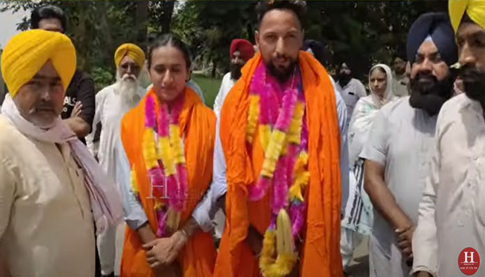 ਗਲਾ ਦੇ ਵਿੱਚ ਹਾਰ ਪਾਈ ਤੁਰੇ ਆਉਂਦੇ ਕਾਂਸਟੇਬਲ ਕੰਬਰਦੀਪ ਸਿੰਘ ਤੇ ਨਾਲ ਉਸਦੇ ਘਰਵਾਲੀ ਹੈੱਡ ਕਾਂਸਟੇਬਲ ਵੀਰਪਾਲ ਕੌਰ ਜਿਨ੍ਹਾਂ ਦੇ ਗਲਾ ਚ ਹਾਰ ਪਾਕੇ ਸ਼ਹਿਰ ਵਾਸੀਆਂ ਵਲੋਂ ਸਵਾਗਤ ਕੀਤਾ ਜਾ ਰਿਹਾ, ਹਾਲ ਈ ਦੇ ਵਿੱਚ ਕੈਨੇਡਾ ਵਿਖੇ ਹੋਈਆਂ ਵਰਲਡ ਪੁਲਿਸ ਖੇਡਾ ਦੇ ਵਿੱਚ ਇਹ ਜੋੜੇ ਨੇ ਜਿੱਤ ਦੇ ਝੰਡੇ ਗੱਡੇ ਨੇ ਵਿਸ਼ਵ ਦੀਆਂ ਕਰੀਬ 70 ਟੀਮਾਂ ਨੂੰ ਮਾਤ ਪਾਕੇ ਇਤਹਾਸ ਸਿਰਜਿਆ ਹੈ,,,,ਇਸ ਜੋੜੇ ਨੇ ਮਿਕਸ ਰੇਲੇ ਵਿੱਚ ਗੋਲਡ ਮੈਡਲ ਅਤੇ 400 ਮੀਟਰ ਰੇਸ ਵਿੱਚੋ ਜਿੱਤਕੇ ਸਿਲਵਰ ਮੈਡਲ ਵੀ ਹਾਸਲ ਕੀਤਾ,,,ਜਿੱਥੇ ਨਾਭਾ ਸ਼ਹਿਰ ਵਿਖੇ ਉਨ੍ਹਾਂ ਦਾ ਨਿੱਘਾ ਸਵਾਗਤ ਕੀਤਾ ਗਿਆ,,,,