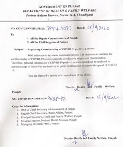 ਕਰੋਨਾ ਕਾਲ ‘ਚ ਹੁਣ ਪੰਜਾਬ ਸਰਕਾਰ ਵੱਲੋਂ ਨਵਾਂ ਆਦੇਸ਼ ਜਾਰੀ ਕੀਤਾ ਗਿਆ ਹੈ ਜੋ ਟੈਸਟਿੰਗ ਕਰਾਉਣ ਵਾਲਿਆਂ ਲਈ ਸੁੱਖ ਦਾ ਸਾਹ ਲੈ ਕੇ ਆਇਆ ਹੈ। ਸਰਕਾਰ ਨੇ ਸਾਰੇ ਜ਼ਿਲ੍ਹਿਆਂ ਦੇ ਡਿਪਟੀ ਕਮਿਸ਼ਨਰਾਂ ਨੂੰ ਆਦੇਸ਼ ਦਿੱਤਾ ਹੈ ਕਿ ਟੈਸਟਿੰਗ ਅਤੇ ਕੁਆਰੰਟੀਨ ਦੇ ਡਰ ਨੂੰ ਘਟਾਉਣ ਦੇ ਲਈ ਮਰੀਜ਼ਾਂ ਦੀ ਪਛਾਣ ਗੁਪਤ ਰੱਖਣ। ਇਸ ਦੇ ਨਾਲ ਹੀ ਮਰੀਜ਼ ਦੀ ਪਛਾਣ ਤੇ ਵੇਰਵੇ ਸਿਰਫ ਇਲਾਜ ਕਰਨ ਵਾਲੇ ਵਿਭਾਗ ਦੇ ਕਰਮਚਾਰੀਆਂ ਤੋਂ ਇਲਾਵਾ ਹੋਰ ਕਿਸੇ ਨੂੰ ਪਤਾ ਨਹੀਂ ਲੱਗਣ ਦੇ ਹੁਕਮ ਦਿੱਤੇ ਗਏ ਨੇ।
