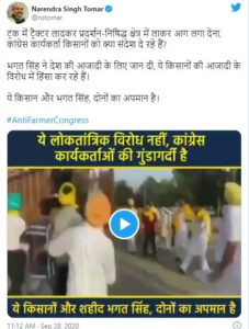 ਦੂਸ਼ਰੇ ਪਾਸੇ ਕੇਂਦਰੀ ਖੇਤੀਬਾੜੀ ਮੰਤਰੀ ਨਰੇਂਦਰ ਸਿੰਘ ਤੋਮਰ ਨੇ ਟਵੀਟ ਕਰਦਿਆਂ ਇਸ ਦੀ ਸਖਤ ਸ਼ਬਦਾਂ ‘ਚ ਨਿਖੇਦੀ ਕੀਤੀ ਹੈ ਉਹਨਾਂ ਨੇ ਕਿਹਾ ਹੈ ਭਗਤ ਸਿੰਘ ਦੇਸ਼ ਲਈ ਸ਼ਹੀਦ ਹੋਏ ਪਰ ਇਸ ਤਰ੍ਹਾਂ ਟਰੈਕਟਰਾਂ ਨੂੰ ਸਾੜ ਕੇ ਮਹੌਲ ਖਰਾਬ ਕਰਨ ਦੀ ਕੋਸ਼ਿਸ਼ ਕੀਤੀ ਜਾ ਰਹੀ ਹੈ।