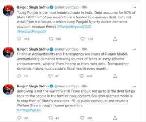 ਆਓ ਅਸੀਂ ਅਸਲ ਮੁੱਦਿਆਂ ਤੋਂ ਦੂਰ ਨਾ ਹੋਈਏ ਜਿਸ ਵੱਲ ਹਰ ਪੰਜਾਬੀ ਅਤੇ ਪਾਰਟੀ ਵਰਕਰ ਇੱਕ ਹੱਲ ਦੀ ਮੰਗ ਕਰਦਾ ਹੈ,”| “ਕਰਜ਼ਾ ਲੈਣਾ ਅੱਗੇ ਦਾ ਰਸਤਾ ਨਹੀਂ ਹੈ! ਟੈਕਸ ਕਰਜ਼ੇ ਦੇ ਨਿਪਟਾਰੇ ਲਈ ਨਹੀਂ ਜਾਣਾ ਚਾਹੀਦਾ, ਸਗੋਂ ਵਿਕਾਸ ਦੇ ਰੂਪ ਵਿੱਚ ਲੋਕਾਂ ਕੋਲ ਜਾਣਾ ਚਾਹੀਦਾ ਹੈ। ਹੱਲ-ਮੁਖੀ ਮਾਡਲ ਰਾਜ ਦੇ ਸਰੋਤਾਂ ਦੀ ਚੋਰੀ ਨੂੰ ਰੋਕਣਾ, ਸਰਕਾਰੀ ਖਜ਼ਾਨਾ ਭਰਨਾ ਅਤੇ ਇੱਕ ਭਲਾਈ ਰਾਜ ਬਣਾਉਣਾ ਹੈ। ਆਮਦਨੀ ਪੈਦਾ ਕਰਨ ਦੁਆਰਾ, ”ਕਾਂਗਰਸ ਨੇਤਾ ਨੇ ਟਵੀਟ ਕੀਤਾ।