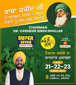 ਫਰੀਦਕੋਟ, 20 ਸਤੰਬਰ 2023 – ਬਾਬਾ ਫਰੀਦ ਜੀ ਦੇ ਆਗਮਨ ਪੁਰਬ ਮੌਕੇ ਨੈਸ਼ਨਲ ਕਬੱਡੀ ਲੀਗ ਮੁਕਾਬਲੇ ਕਰਵਾਏ ਜਾ ਰਹੇ ਹਨ। ਇਹ ਮੁਕਾਬਲੇ 21 ਤੋਂ 23 ਸਤੰਬਰ ਤੱਕ ਹੋਣਗੇ। ਇਸ ਸੰਬੰਧੀ ਚੇਅਰਮੈਨ ਡਾ. ਵਰਿੰਦਰ ਭੁੱਲਰ ਨੇ ਜਾਣਕਾਰੀ ਦਿੰਦੇ ਹੋਏ ਦੱਸਿਆ ਕਿ ਇਹ ਮੁਕਾਬਲੇ ਕਬੱਡੀ ਹਾਲ ਨੇੜੇ ਨਹਿਰੂ ਸਟੇਡੀਅਮ ਫਰੀਦਕੋਟ ‘ਚ ਹੋਣਗੇ।