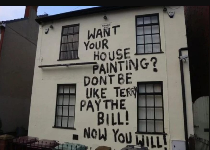 ਇਸ ਪੇਂਟਰ ਦਾ ਨਾਮ ਡੀਨ ਰੀਵਸ ਹੈ l ਡੀਨ ਨੇ ਮਕਾਨ ਮਾਲਿਕ ਦੇ ਨਾਮ ਨੂੰ ਸ਼ਾਮਿਲ ਕਰਦੇ ਹੋਏ ਘਰ ਦੀ ਬਾਹਰੀ ਦੀਵਾਰ ‘ਤੇ ਲਿਖਿਆ ਹੈ ਕਿ ਜੇਕਰ ਤੁਸੀਂ ਆਪਣ ਘਰ ਪੇਂਟ ਕਰਵਾਉਣਾ ਚਾਹੁੰਦੇ ਹੋ ਤਾਂ ਟੇਰੀ (ਮਕਾਨ ਮਾਲਿਕ ਦਾ ਨਾਮ) ਦੀ ਤਰ੍ਹਾਂ ਬਿਲਕੁਲ ਨਾ ਬਣੋ, ਬਿੱਲ ਦਿਓ, ਹੁਣ ਤਾਂ ਤੂੰ ਜ਼ਰੂਰ ਬਿੱਲ ਦੇਵੇਂਗਾ l